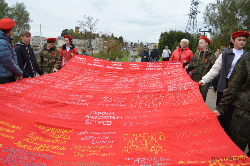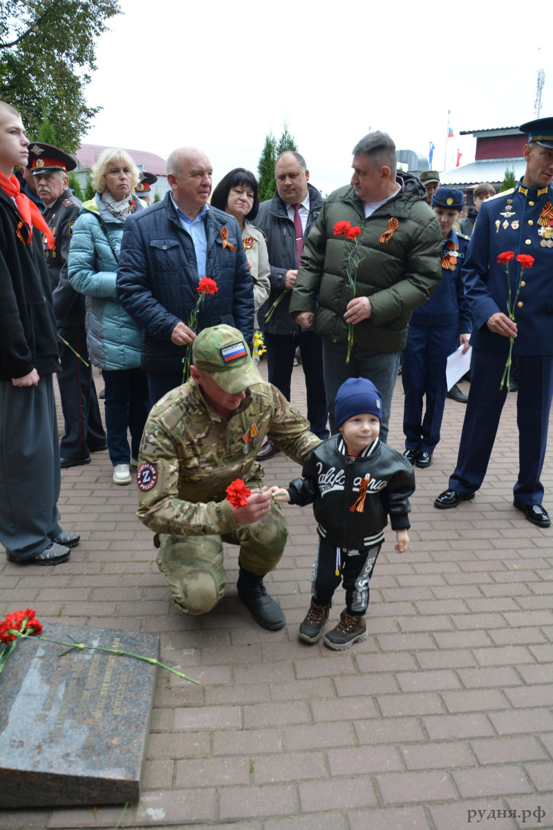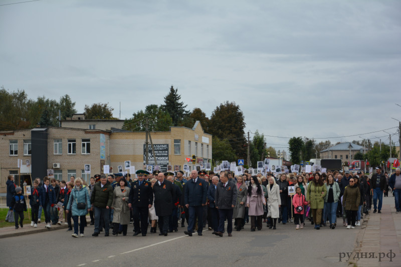 Возложение цветов началось с братской могилы возле средней школы № 2 г.Рудни, памятника «Катюша». Возложение цветов состоялось в Парке Героев и у бюста знаменосца Великой Победы Героя Советского Союза Михаила Алексеевича Егорова. Здесь состоялось торжественное вручение медалей «100 лет Герою Советского Союза М.А.Егорова». Глава округа Юрий Иванович Ивашкин за личный вклад в сохранение и популяризацию исторического прошлого, патриотическое воспитание подрастающего поколения вручил данную медаль генерал-лейтенант ФСБ России Резниченко Юрию Владимировичу и участнице специальной военной операции, ефрейтору Швецовой Глории Петровне. Затем колонна руднян проследовала к братской могиле возле городского Дома культуры.