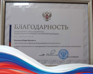 Юрий Ивашкин, Глава Руднянского муниципального округа, за заслуги в развитии местного самоуправления Смоленской области и многолетний добросовестный труд отмечен Благодарственным письмом Председателя Совета Федерации Федерального Собрания Российской Федерации.